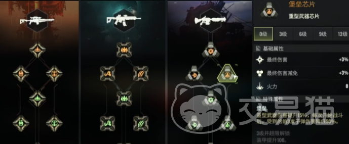 重型武器可以装备堡垒芯片,这个芯片能提升重型武器15%的伤害,还能让每次战斗时受到的前三发子弹伤害降低,该芯片在升级到9级后更是能将三发子弹改成六发,击打提升玩家的生存能力。