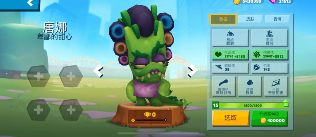先来了解一下角色的属性面板,生命值高达1800,伤害也达到了可观的1300,数值十分可观,而且她还拥有一个外号“卑鄙的甜心”,就可以看出来她是一个擅长在动物园潜伏的角色了,不仅伤害力超高,而且能出其不意的打出高爆发的伤害。