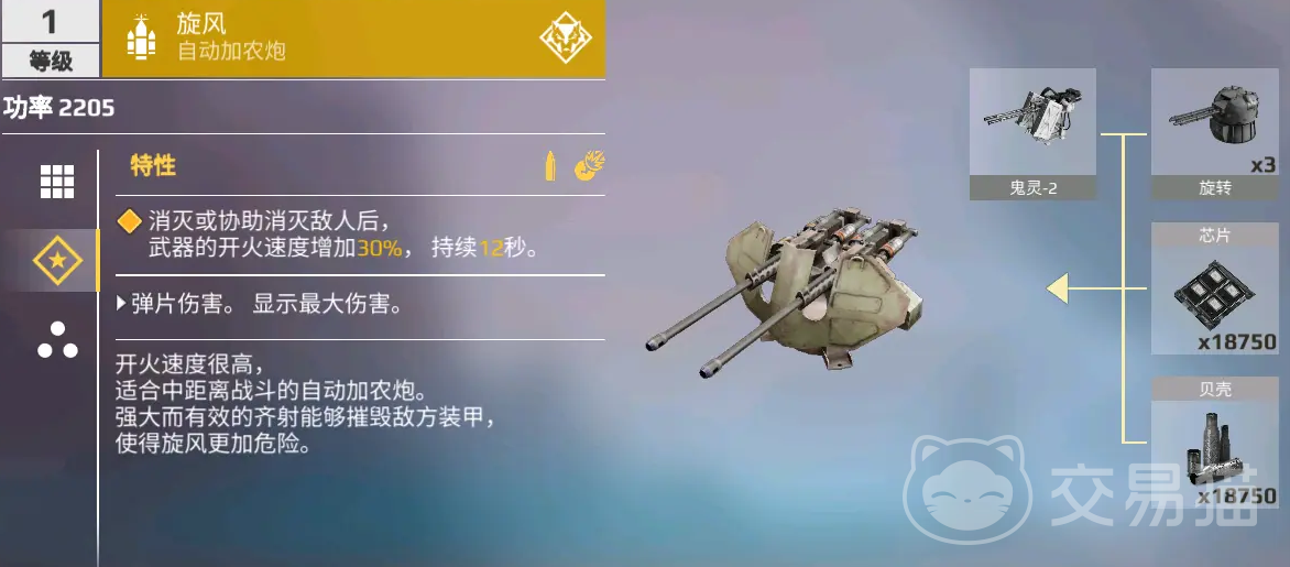 旋风能在击败或协助击败的时候,提升自身30%的开火速度,在提升后在开火速度上基本上没有什么武器装备可以比过,能摧毁敌方的装甲,很适合喜欢快速战斗的玩家使用。