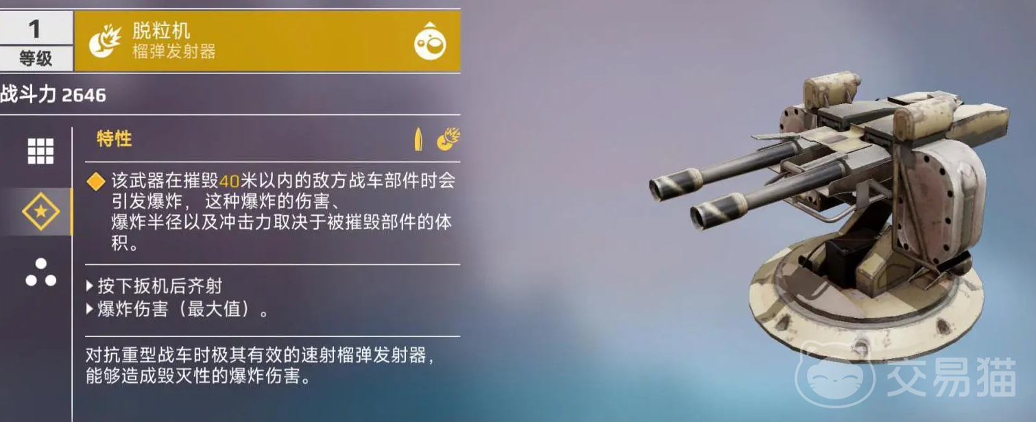脱粒机的特性能在摧毁40米内敌方部件的时候,引发一次爆炸,爆炸的伤害和半径会根据被摧毁部件的体积来决定,这种特性也是在鼓励玩家多进行中近距离战斗,只要能成功摧毁敌方部件,就能造成不小的伤害。