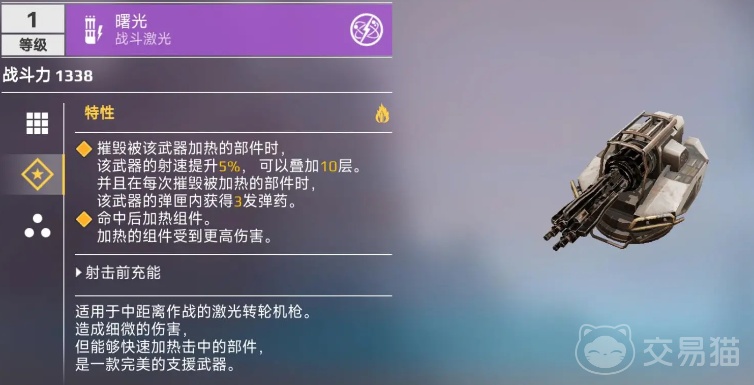 曙光在实战中它更偏向于支援功能,因为曙光本身在伤害上面并不突出,主要是依靠击中并加热敌方部件,使得该目标后续攻击会受到更多伤害,这种加热效果对一些有很高耐久度的部件非常有效,但是美中不足的地方在于,每次部件被顺利拆毁后,新的部件需要重新进行加热,通过情况下曙光会搭配其他武器,比如说机枪和等离子发射器等一同进行使用,提高它们拆毁部件的效率。