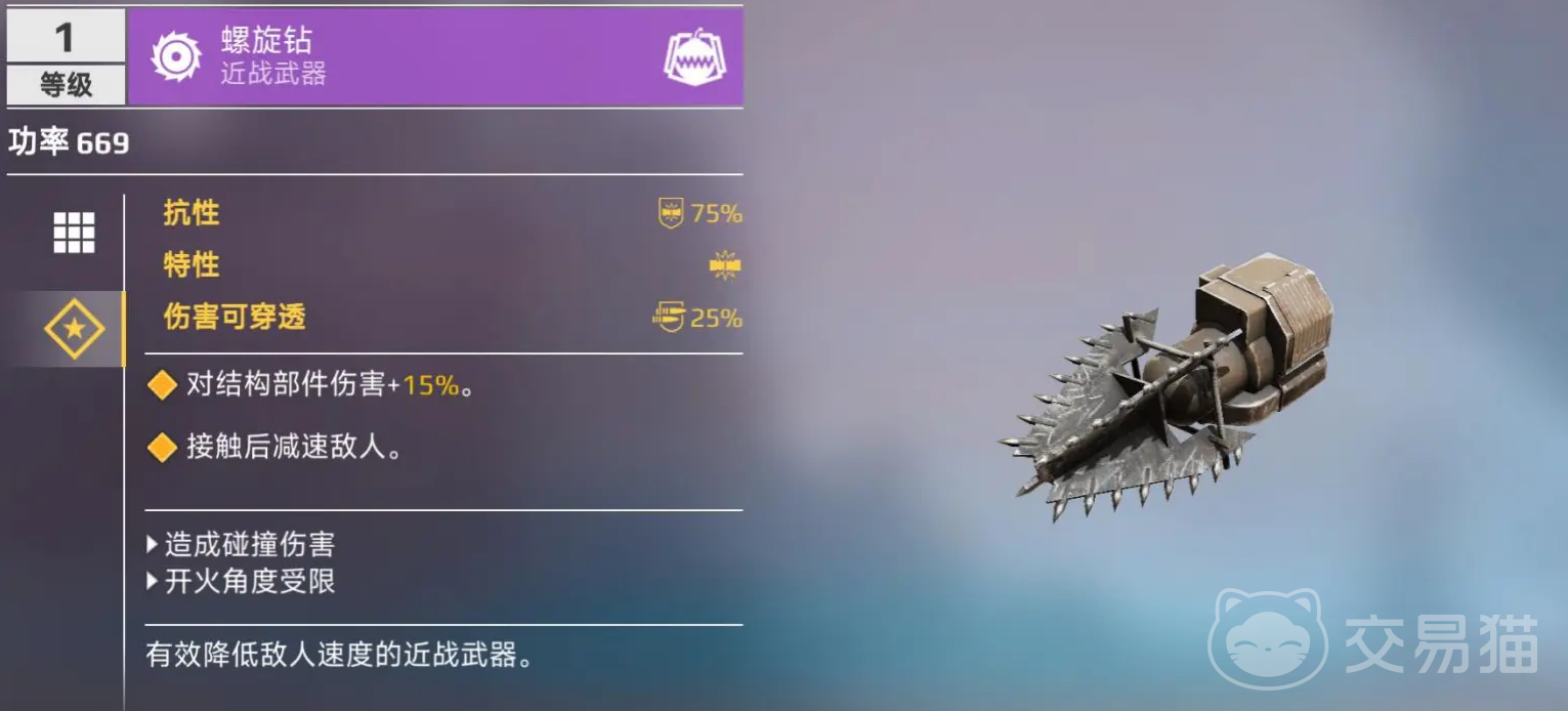 螺旋钻是近战武器,它的特性是对结构部件造成额外伤害,且在接触敌方战车的时候产生一定的减速效果,这个特性能让它在近战过程中持续性造成伤害,但如果被保险杠等高耐久部件阻挡的话,可能需要耗费一定时间来破坏。