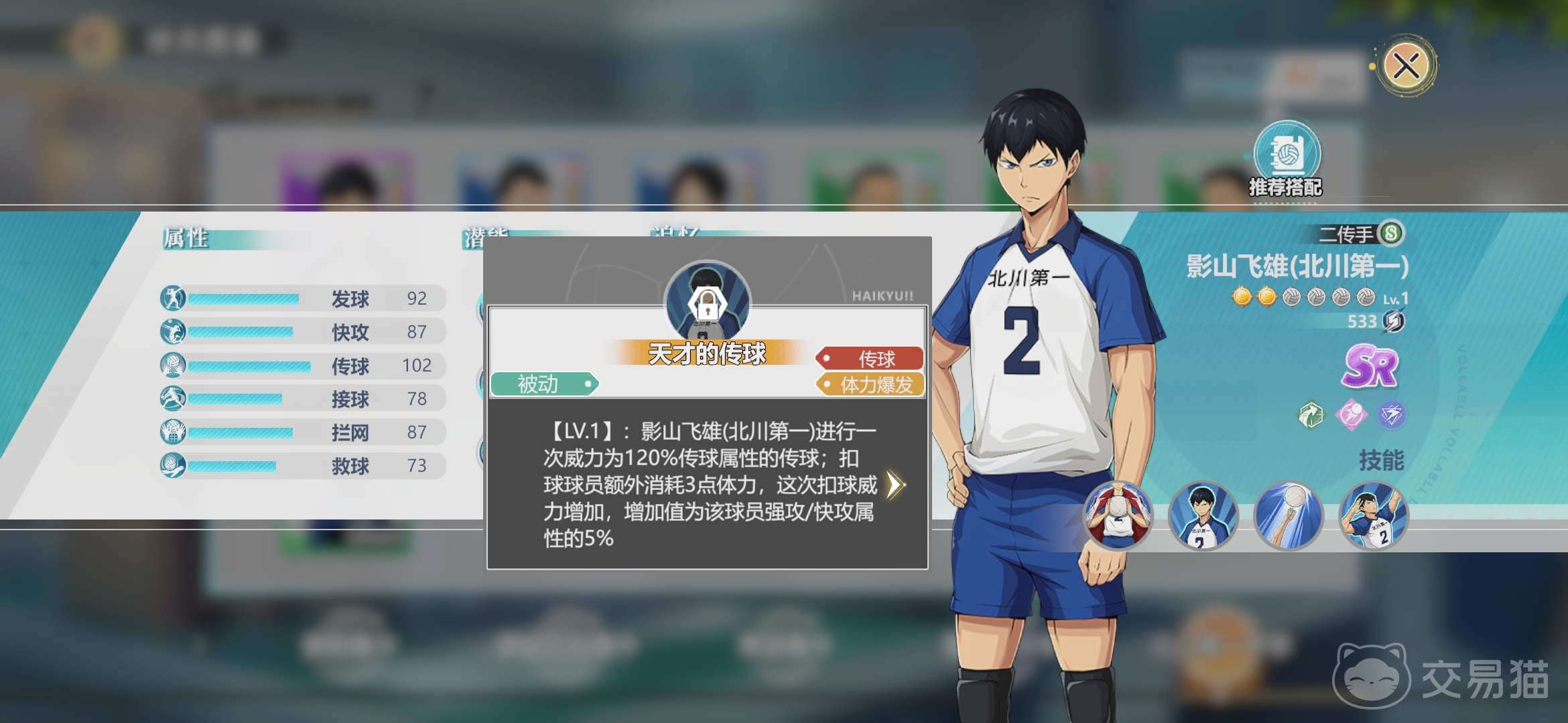 关于排球少年手游北川第一中学强度排行就给大家分享到这里了,影山飞雄ssr卡游戏内的获取难度还是比较高的,正好北川影山也能够承担前期所有阵容中二传手的重任,可以重点培养为快攻特性,希望对大家有所帮助。