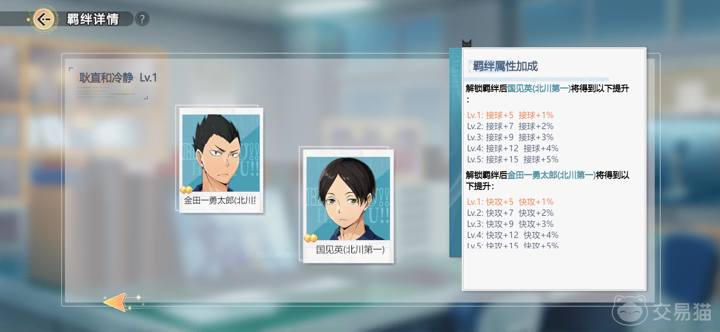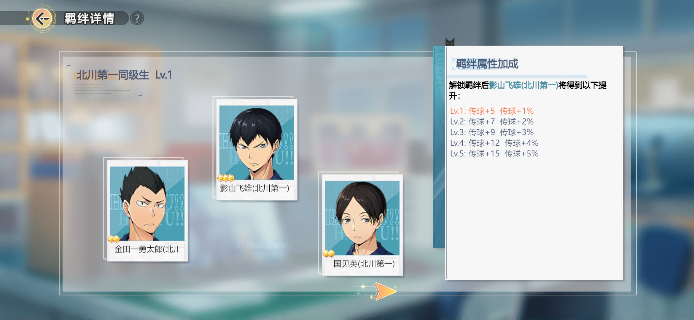 而这所中学唯一一个羁绊就是影山飞雄和金田和国见英,激活之后会增加影山的传球能力,就是在动漫中影山对于主副攻手的要求特别高所以和队友的关系很差,但确实影山当时的实力极为恐怖。后来即将进入高中时遇到了惺惺相惜的日向,两个人在进入乌野高中后才成为最好的搭档。