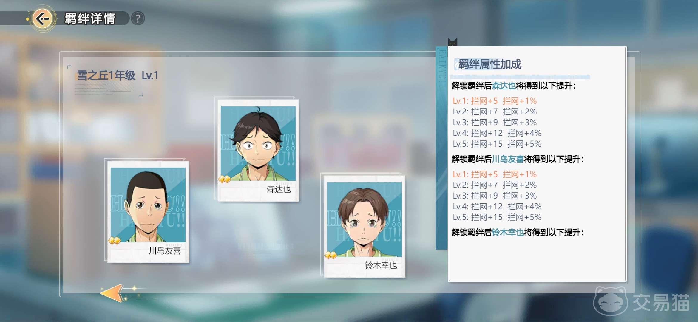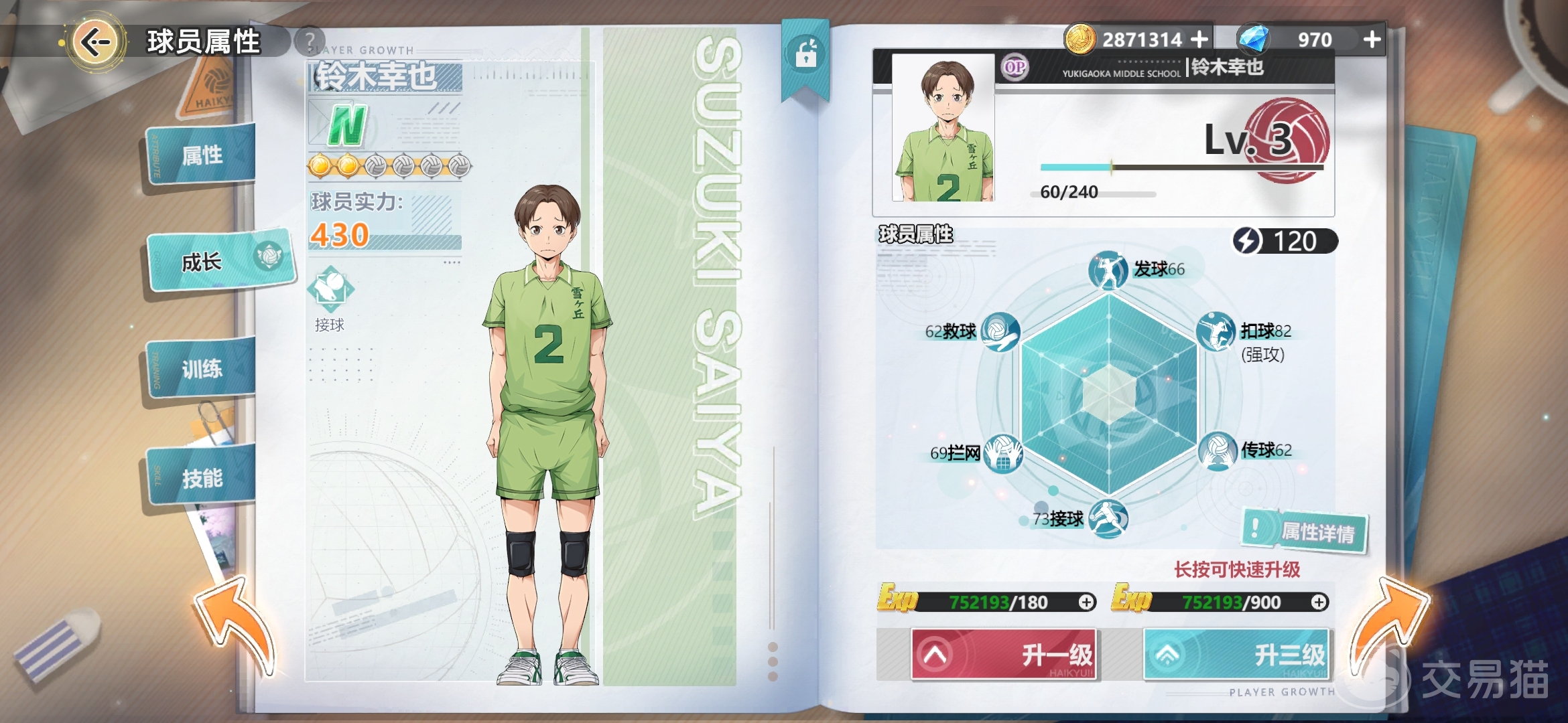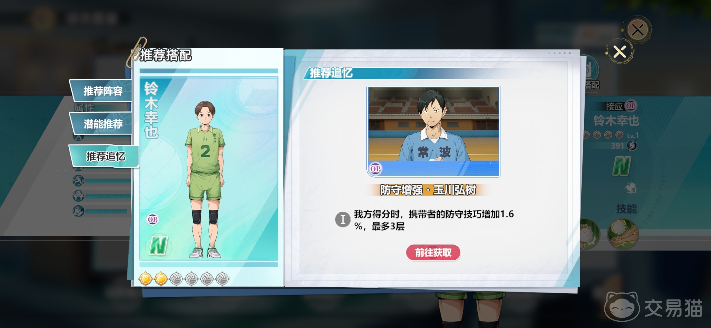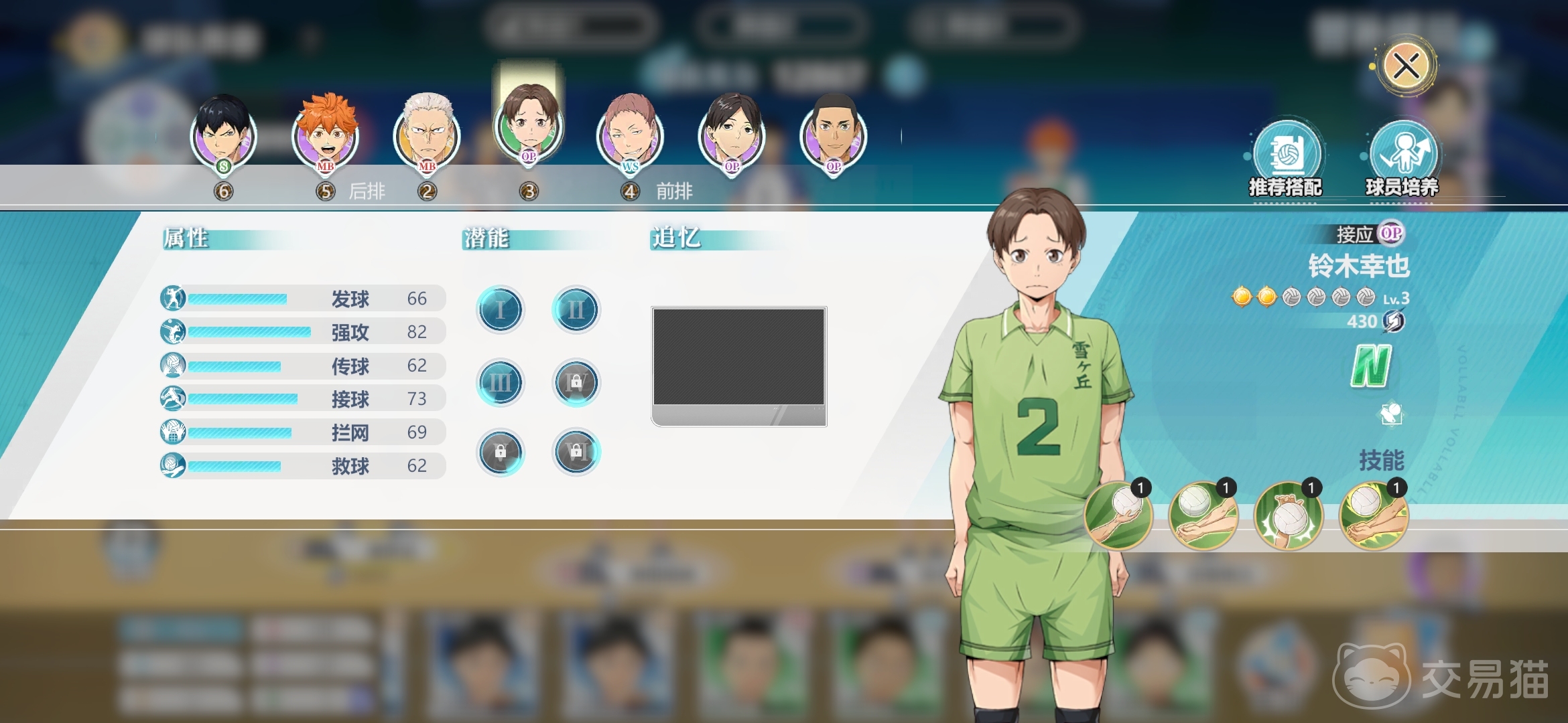 游戏正式上线后会上线潜能属性玩法,也就相当于装备。激活潜能套装助攻接球可以使其增加接球属性的同时,额外增加扣球威力。如果玩家目前没有合适的op角色培养的话,可以,让铃木携带着玉川的防守增强增益,可以在我方得分的时候额外增强我方防守技巧。由于op接应在游戏内的球员数量是最少的,前两个推图关卡章节可以用铃木过度。
