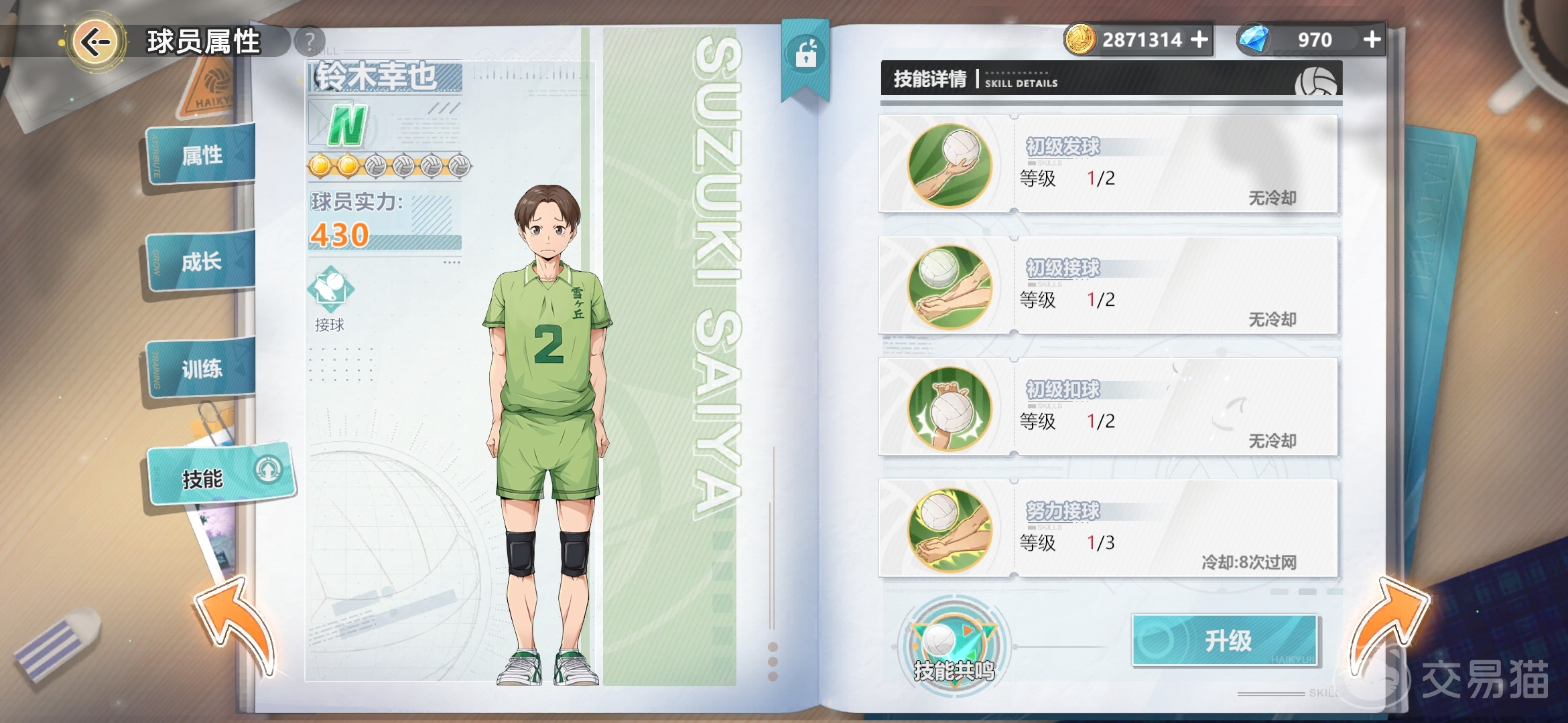 铃木在手游中的位置是op接应,具体的作用其实就是既进攻又防守,主要就是辅助二传手,观察二传手组织进攻的动向从而在跑动的过程中将求传给主攻或者副攻手。他的四个技能中也是有三个基本被动:初级扣球,初级接球和初级发球,分别会在铃木上场的时候增加强攻接球和发球属性5%;主动技能努力接球同样的是进行一次165%接球属性的接球,这也是他作为op接应的技能特性。