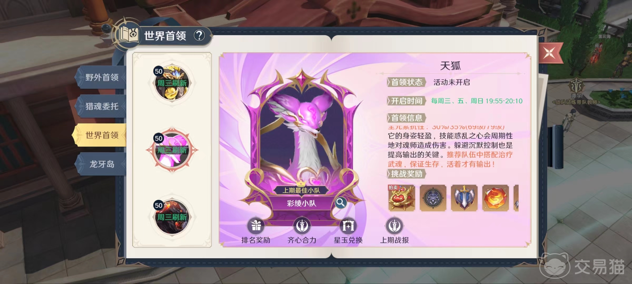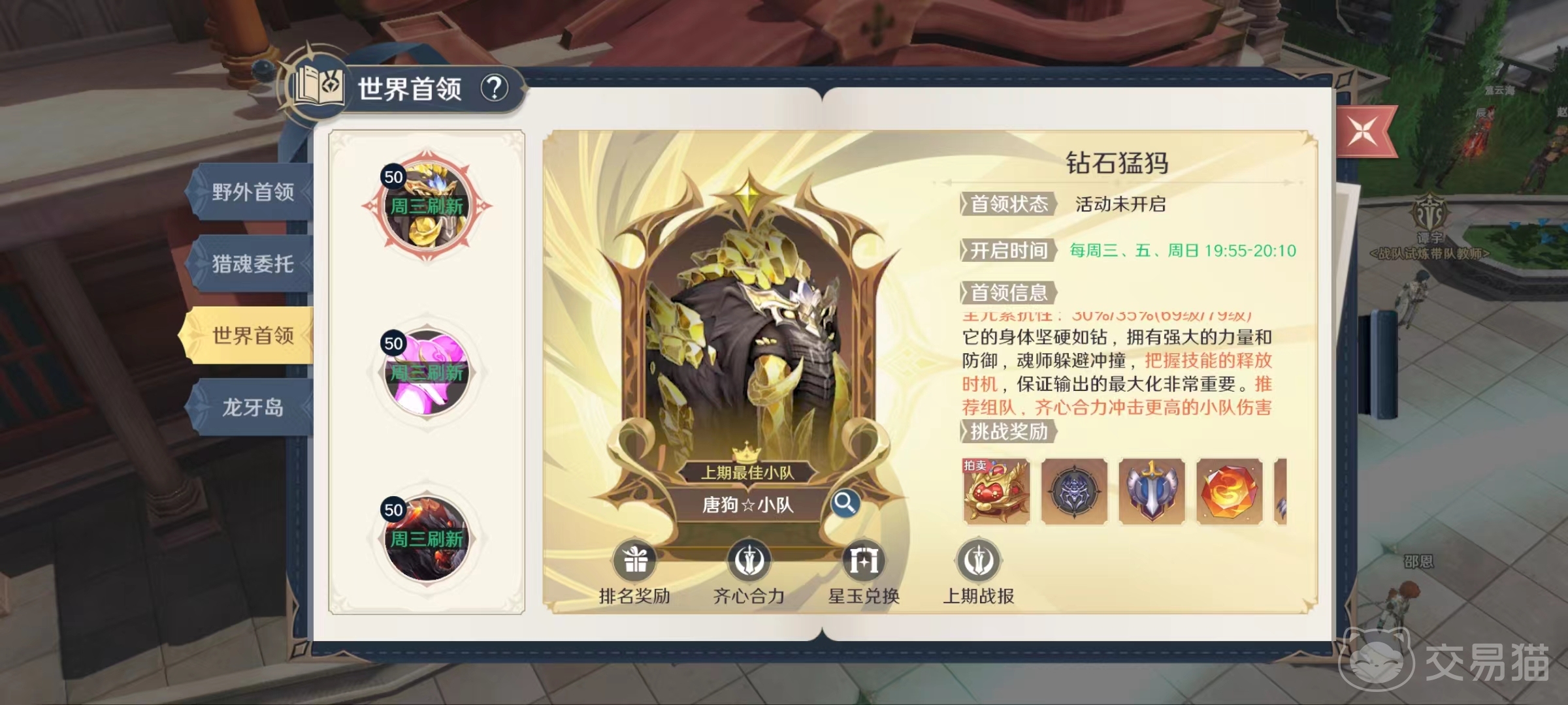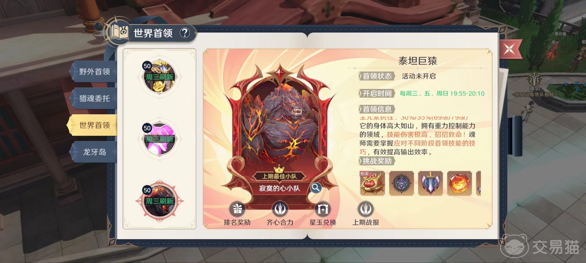 想要进入世界首领有两种途径,当世界首领刷新的时候,在大家界面的右侧就会直接显示图标,到时可以直接点击加入。也可以在冒险中选择挑战里的野外首领,在这里也有世界首领的相应界面。世界首领开启有一定的时间限制,只会在每周三、五和周日的19:55~20:10这一时间段开启。所以大家首先要牢记时间节点,不然很容易就错过。