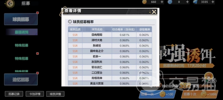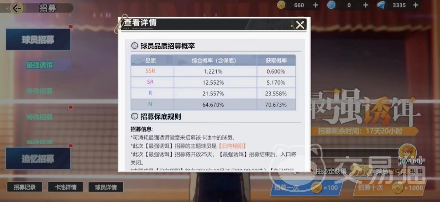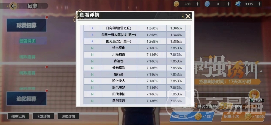 不过,获得不同等级球员的具体概率是不同的,此外大家也可以尝试多次抽卡,相比常驻卡池来说,一般活动期间只要存在的卡池,都是有基础保底的,其他的角色被招募的几率也是更高的,这一点大家可以点开卡池的图鉴来查看每一个角色的获取几率哦。