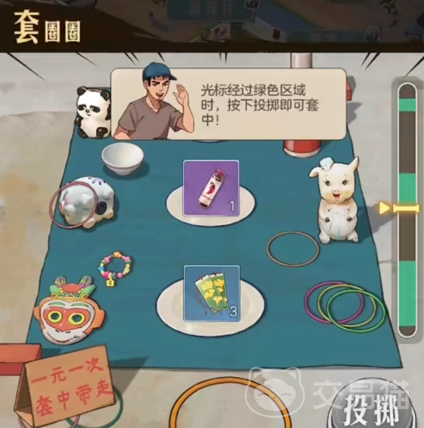 在《时光杂货店》这款游戏中,玩家套圈时系统会给出提示,当游戏指针到达绿色区域的时候点击“投掷”,就有机会套中。玩家可以多尝试一下,找到手感以后就会好套一些,但并不是每一次投掷都可以套中,并且每次游戏只有一次机会,玩家可以等待下次套圈光标出现在进行投掷。