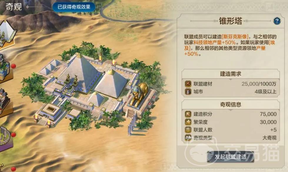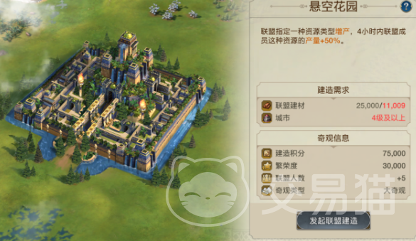 奇观分为大奇观和普通奇观,大奇观能加30000的联盟繁荣度,普通奇观只能加10000联盟繁荣度,玩家到达文艺复兴阶段就能解锁第一批奇观,分别有悬空花园、锥形塔、巨像、海豚星座以及环状列石。