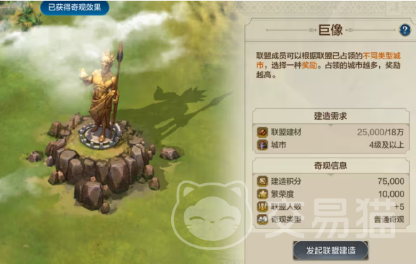 剩下的巨像、海豚星座和环状列石都属于普通奇观,巨像的作用是根据联盟占领城市的量来选择一种奖励,占领城市越多奖励越丰厚,算是成长型建筑,适合喜欢打城的联盟,环状列石能选择一种基础资源进行强化,增加5%的产量,这个非常普通没有什么优先级,最后的海豚星座能在成员完成事件后增加奇观的进度,有需要的玩家可以选择这个。