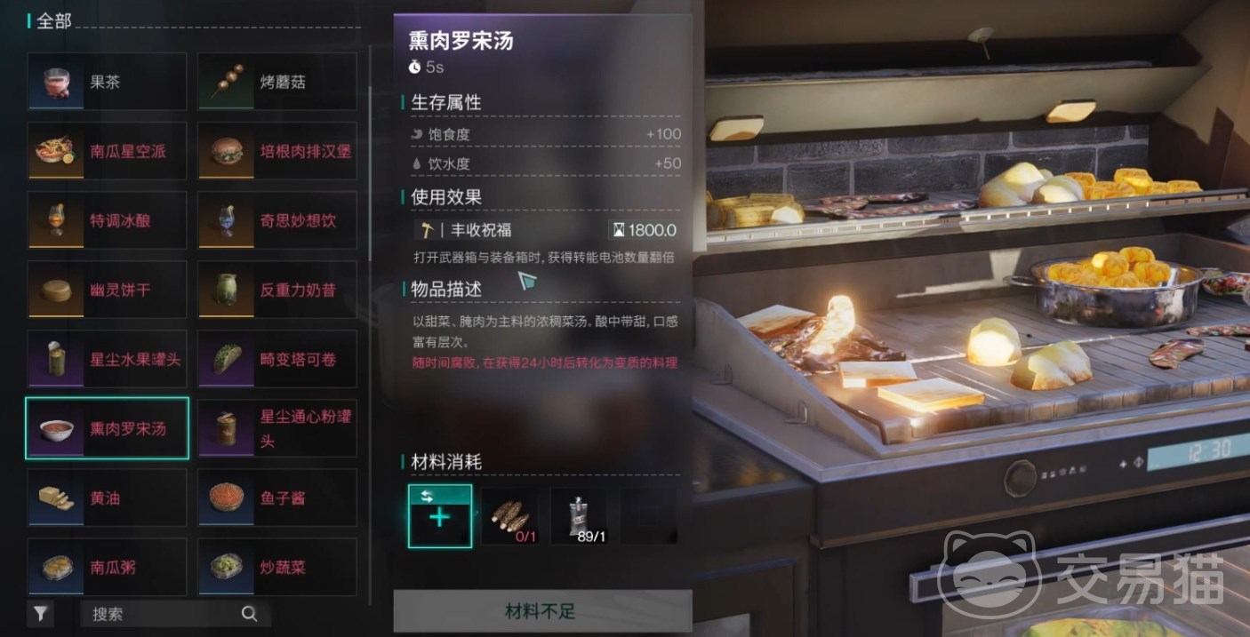 先说说熏肉罗宋汤有什么用,生存属性方面可以提100点饱食度50点饮水度,可以说是有吃有喝了。这还不是关键,重点是它自带的“丰收祝福”效果,可以提升在开武器箱、装备箱时获得的电池数量,直接翻倍。
