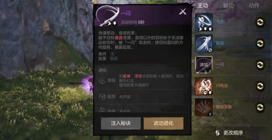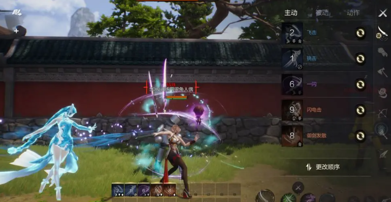 闪电击,快速挥剑2连击,最多可以攻击2个目标,命中也会打出僵直。在用闪电击的时候可以在短时间内手动用攻击键穿插使用“轻拔剑”。这个技能在强化后会增加作用目标,很适合用来清小兵,在打无限塔的时候挺好用的。