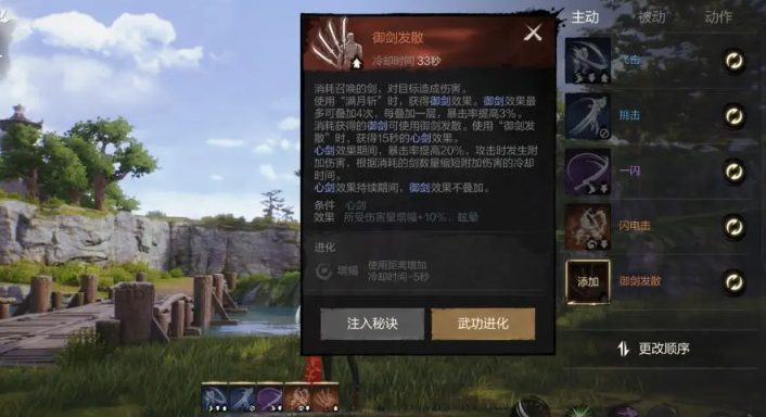 御剑发散,强化技,在用满月斩得到御剑效果叠加暴击到12%(4层)后,消耗御剑效果来获得存续15秒的剑心效果,暴击率提升20%,并且在攻击的时候还会附加额外伤害,根据消耗的御剑数量来缩短附加伤害的冷却。当然,在心剑这个效果持续期间内,御剑效果是不叠加的。