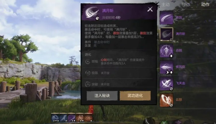 满月斩,在攻击附近目标造成暴击伤害的时候可以激活该技能,使用后可以积攒一层“御剑”效果叠加暴击率,最多叠4层,而暴击率对剑这个这个武器是非常重要的,能不能打出高伤害就看有没有暴击。