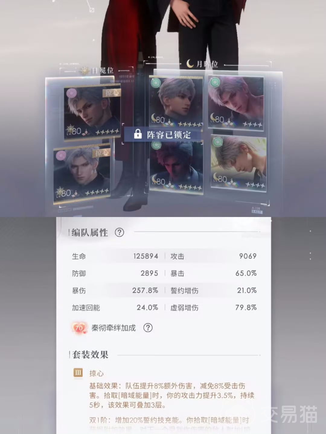 不同阶段的套装效果分别是:双一阶增加10%誓约大招充能。双二阶减免5%的受击伤害。双三阶队伍提升5%的额外伤害。