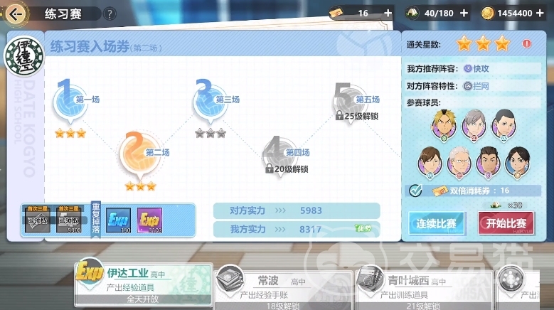 特别要注意的是1号发球位,轮转至1号位的球员会负责开场发球,因此把发球实力强劲的球员轮转至1号位开场很重要,能让大家在比赛开始就取得优势,另外也可利用角色之间的技能去确认上阵角色,游戏中有上阵羁绊的球员组合,当它们的全部球员都出场时,可激活羁绊技能,比如当己方场上同时有同一学校的4名及以上球员时,可为场上所有球员带来属性的提升。
