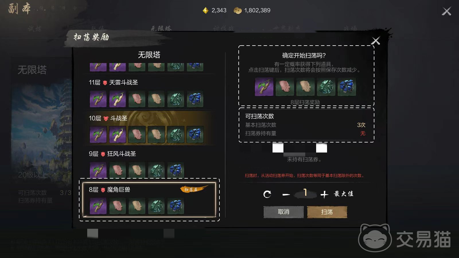 最后小编给大家总结一下,无限塔副本的一些技巧,首先这是一个优先度非常高的活动,一定要及时去刷,每天都会恢复一定的扫荡次数,所以每天尽量爬到更高层次的塔,然后再使用扫荡,这样可以最大限度地获得奖励。主要奖励包括武功强化材料、装备强化材料、试炼副本充能石选择箱以及其他相关奖励等。