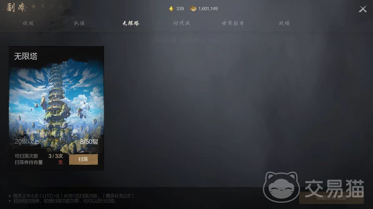 无限塔属于单人副本的一类,在20级以后开启,每层boss只能刷一次,只有先战胜了前一层的boss,才可以继续往下继续战斗,每次击败boss都可以获得首次奖励。挑战boss次数是不限的,也就是大家可以一直往下挑战下去,一直到过关为止。但是在挑战的时候也要先看一下推荐等级和能力值,不然也只能是浪费时间。当家在当前层级进行扫荡时也可以获得对应奖励,每天有三次扫荡次数上限,会在每天上午4点补充一次。