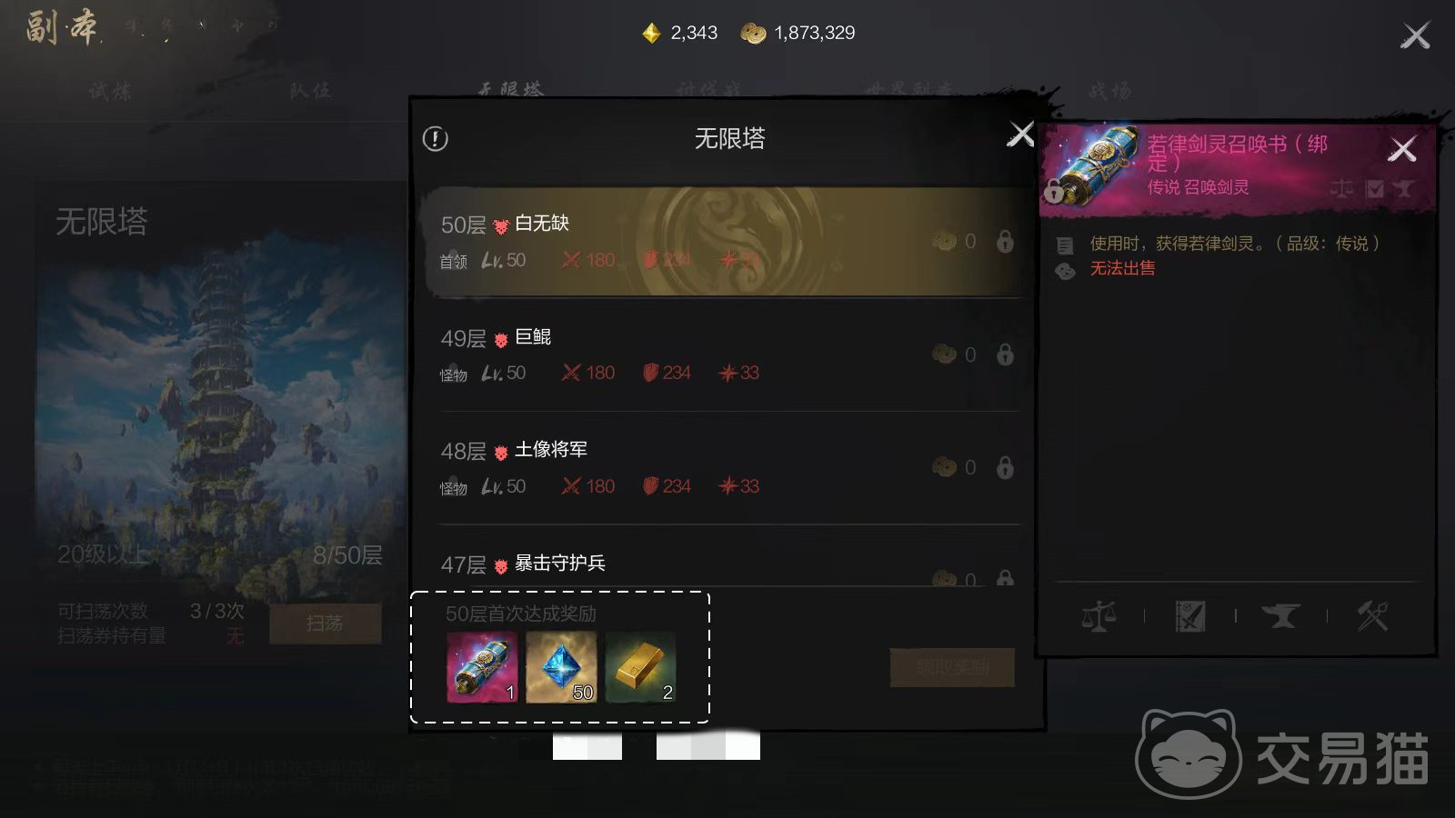 扫荡可以获取的奖励是在前面基础上进行增加,其中1~19层奖励各种灵药、秘诀和寒玉碎片用于强化武功、武器、防具。20~29级增加了试炼副本充能石选择箱作为奖励,30~50层则增加了奖励获得券,增加普通组队副本的额外次数等。其中第10层,20层,30层和40层可以获取武功秘籍,最后50层能够获得若律剑灵召唤书,可以召唤出传说剑灵。目前根据资料,无限塔只开放到50层。