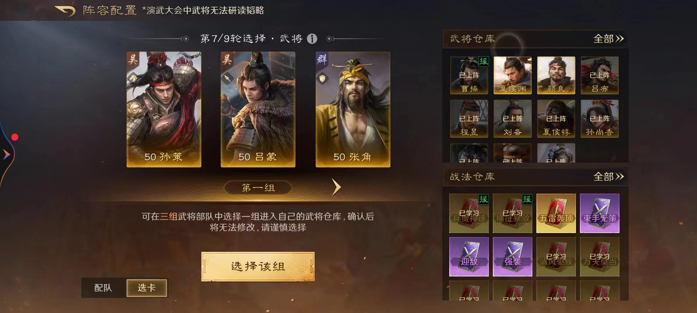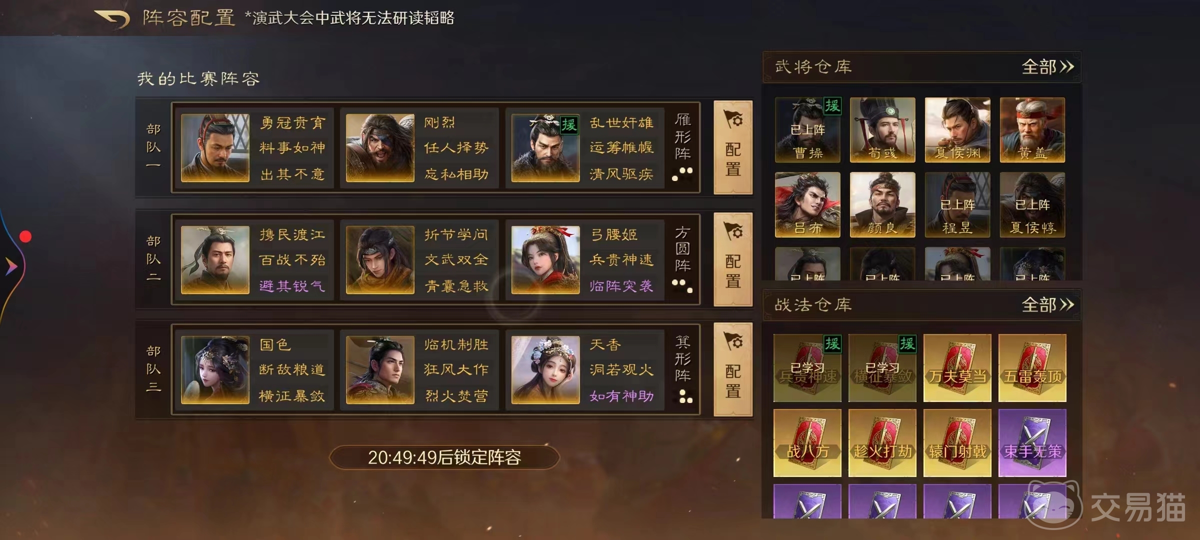 在配队时,玩家应优先考虑双C一辅的阵容结构,确保每队至少有一个靠谱的核心输出武将。同时,同国籍、同兵种的加成在演武会中尤为重要,玩家应尽量选择能够触发这些加成的武将进行搭配。周瑜、诸葛亮、法正以及战法摧坚克难、胜敌益强、三军夺气都是非常好的战法与武将,也是玩家演武过程中必须选择的。