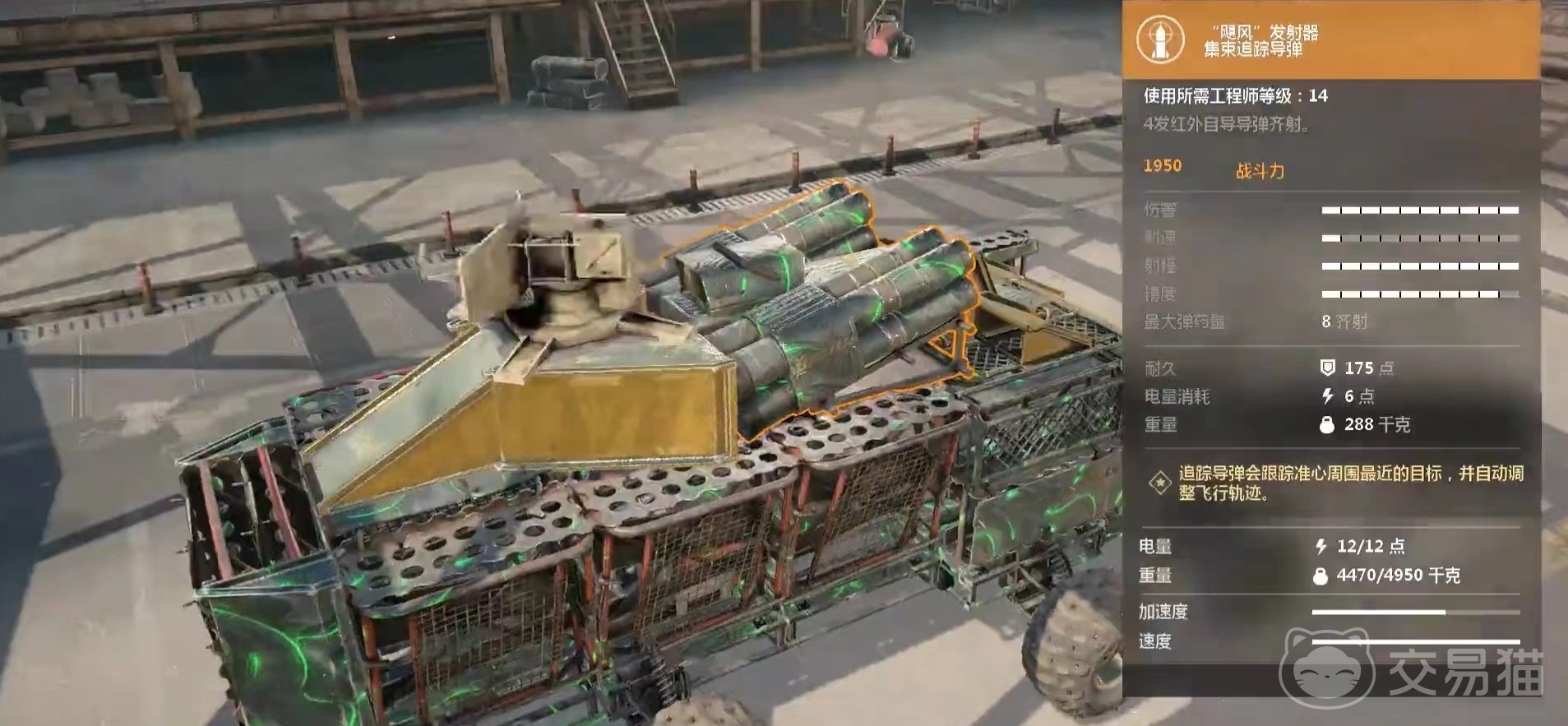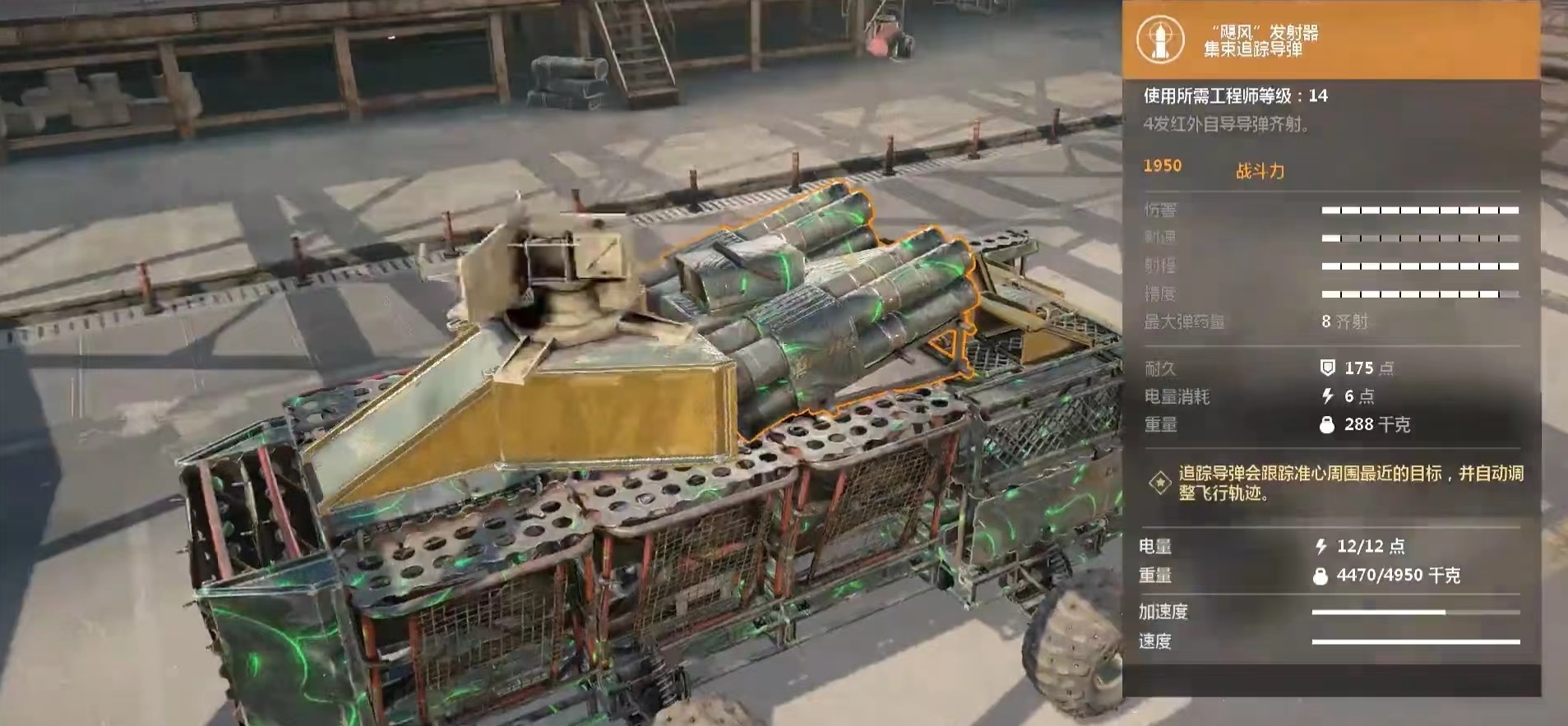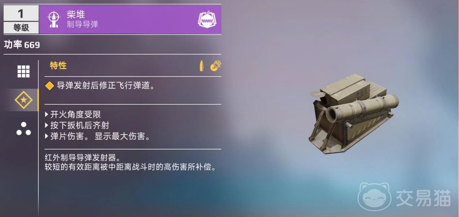 首先推荐大家使用的就是非常熟悉的柴堆,柴堆属于制导导弹,具有命中率高和强大攻击力等优点。它在发射之后可以修正飞行弹道,虽然有着开火角度受限的缺点,但依然掩饰不了它在战斗中的强势。作为一种红外制导导弹发射器,它在较短的有效距离上可以爆发出很高的伤害,如果对方不了解应对办法,很有可能受到单方面的火力压制。但是在使用时候大家要注意,弹道速度比较慢,装填时间比较长,所以一般是在特定情况下使用在,极限距离上进行火力投射。