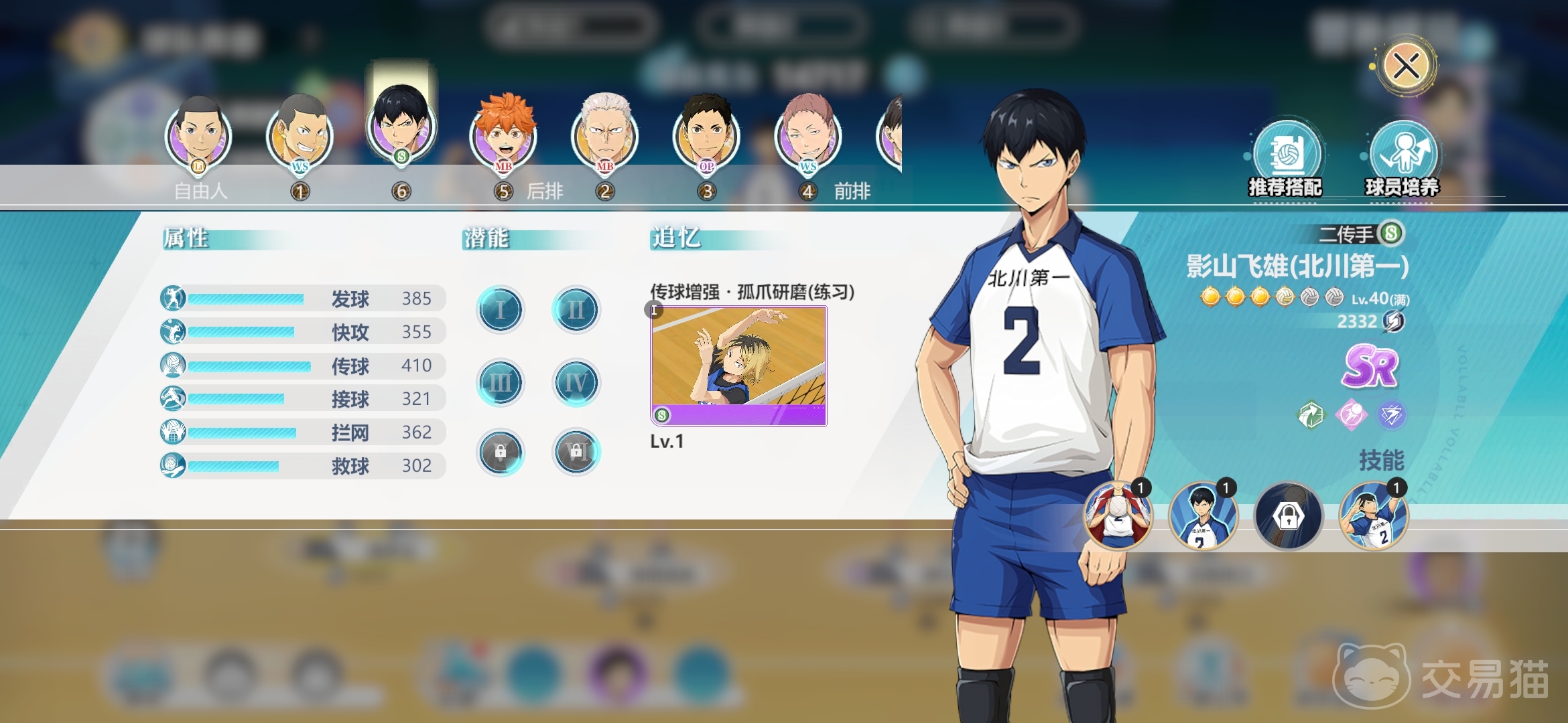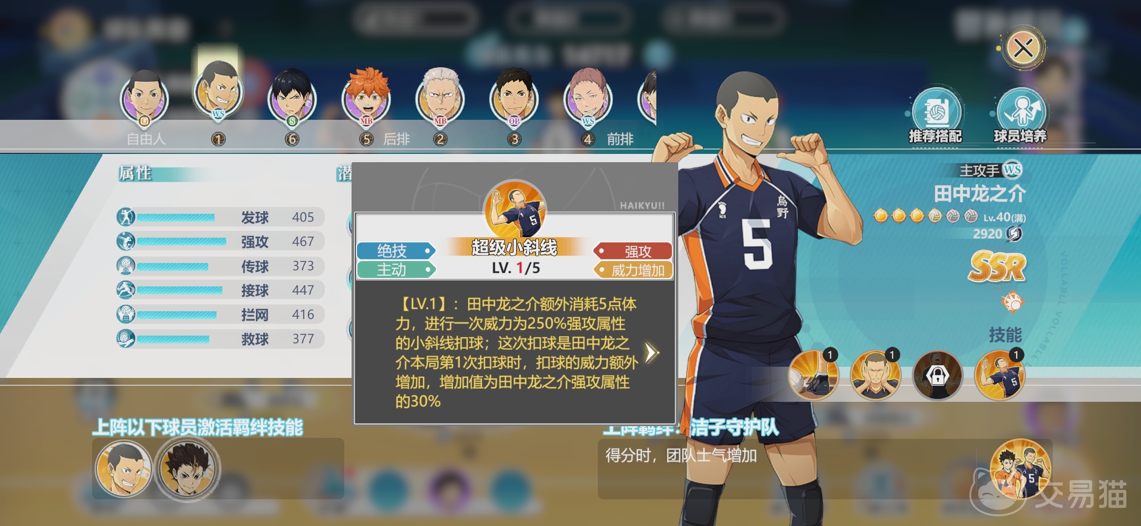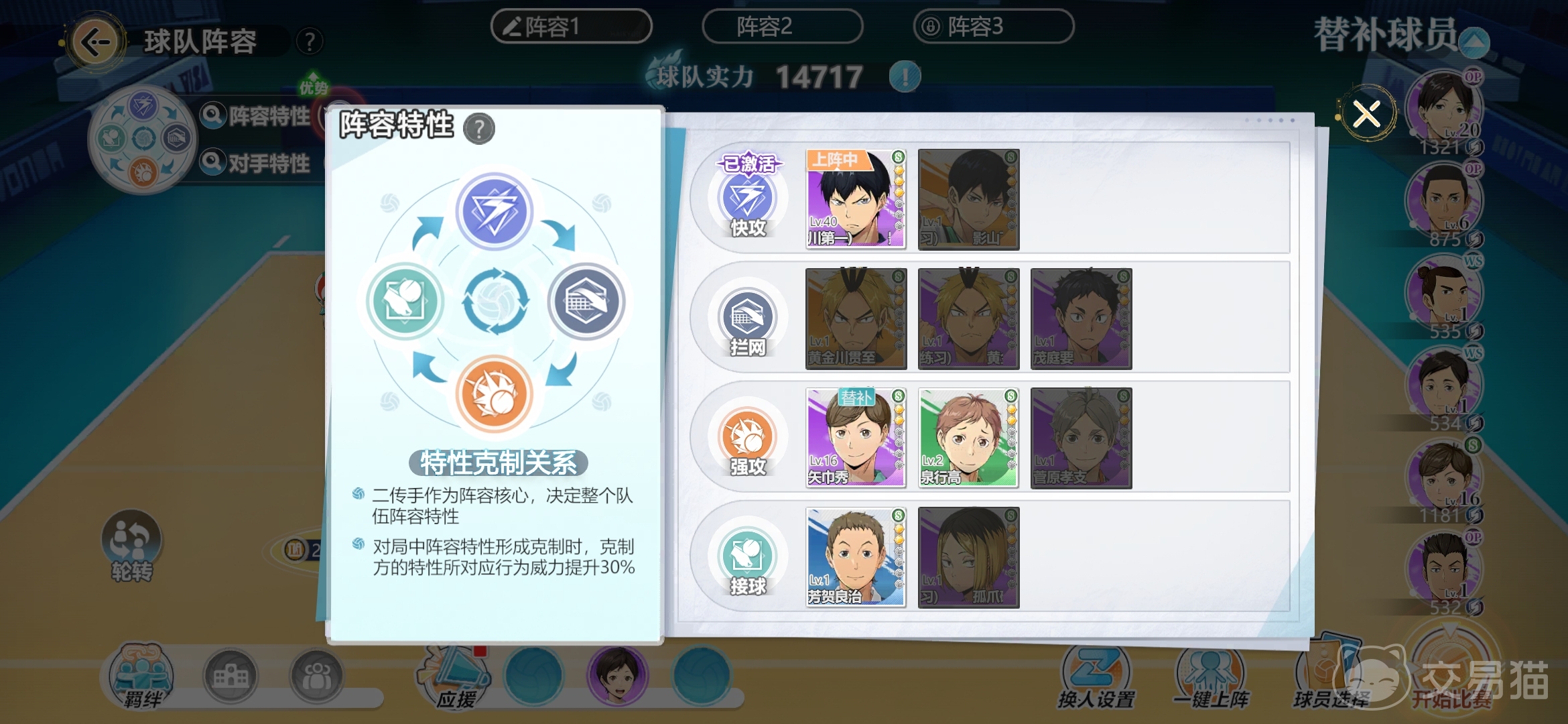 对局中阵容特性如果形成克制关系,克制的特性直接对被克制方提升30%的威力。目前这款游戏的内测版本中其实二传手位置的并不是很多,快攻属性有影山飞雄两个版本;拦网属性有黄金川贯至两个版本和茂庭要;强攻属性有矢巾秀、泉行高和菅原孝支;接球属性有方贺良治和孤爪研磨练习版本。