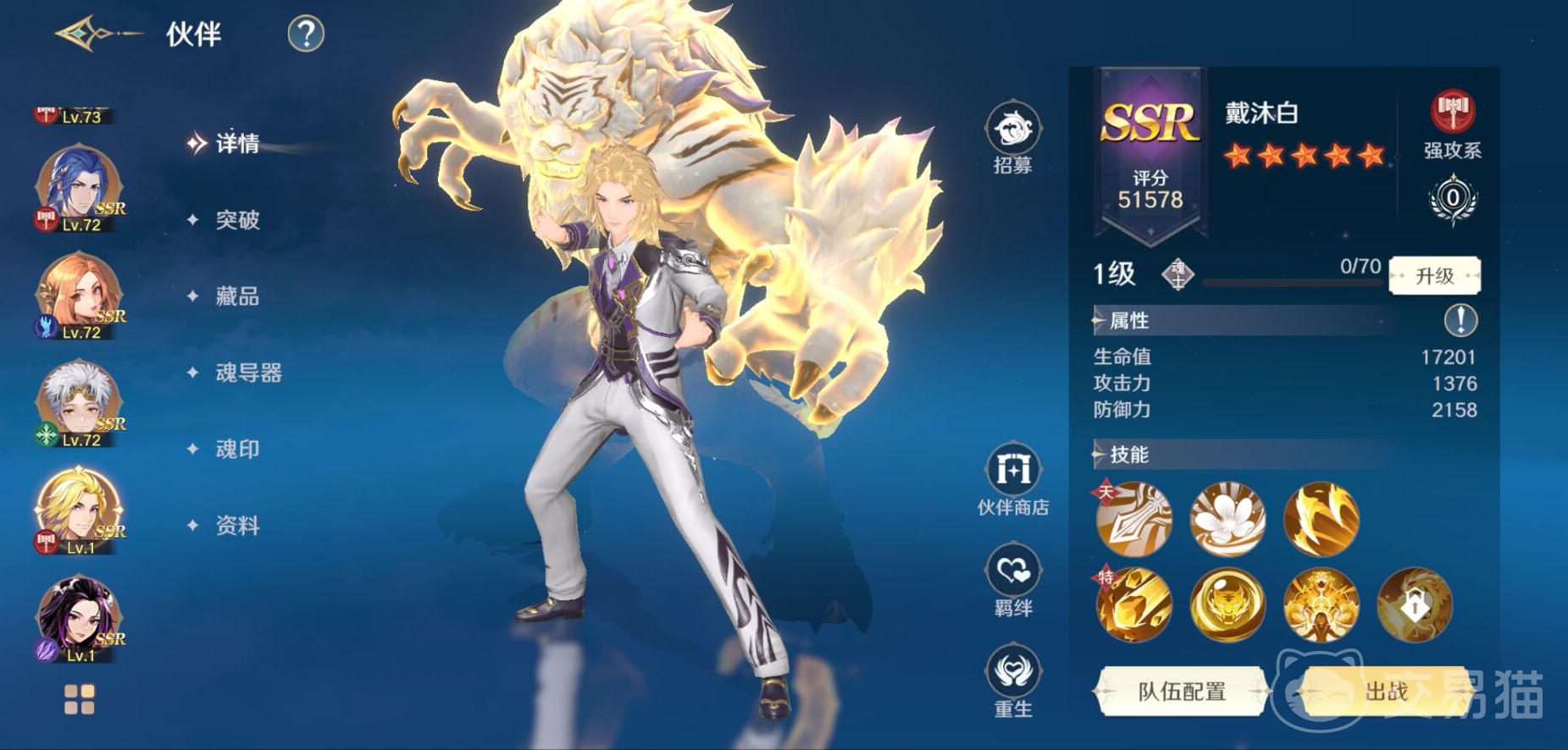 这个伙伴同样十分的强大,比较擅长近距离对敌人输出。首先是天赋效果,队友如果没有被击杀,那么他的攻击以及防御都增强3%。”爪击”的主动,可以对敌人进行连击;白虎流星雨使用后也能够对敌人进行多至5次的连击,同时范围内最多可以对8个敌人造成伤害,同时还会附加50%光属性的损伤,还有10%的几率给敌人添加破甲效果。白虎护身障就是一个防护技能了,可以给自己添加护盾,能提升10%最大生命值,而且也可以给队友带来300的防御效果,还有5%的减伤效果。