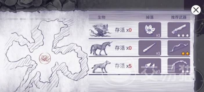 进入花园后,可以查看一下任务信息。这里生存着三种生物。最中间的算是个Boss荧光花王,推荐使用火铳;另外有几只独角兽,就是头顶有角的马,推荐用反曲弓;而鬣狗则推荐用铁皮弓。虽然说都是弓,但铁皮弓与反曲弓区别还是挺大的;前者稳定性好,射程远,适合持续攻击;而反曲弓爆发和伤害高,适合爆发打法。
