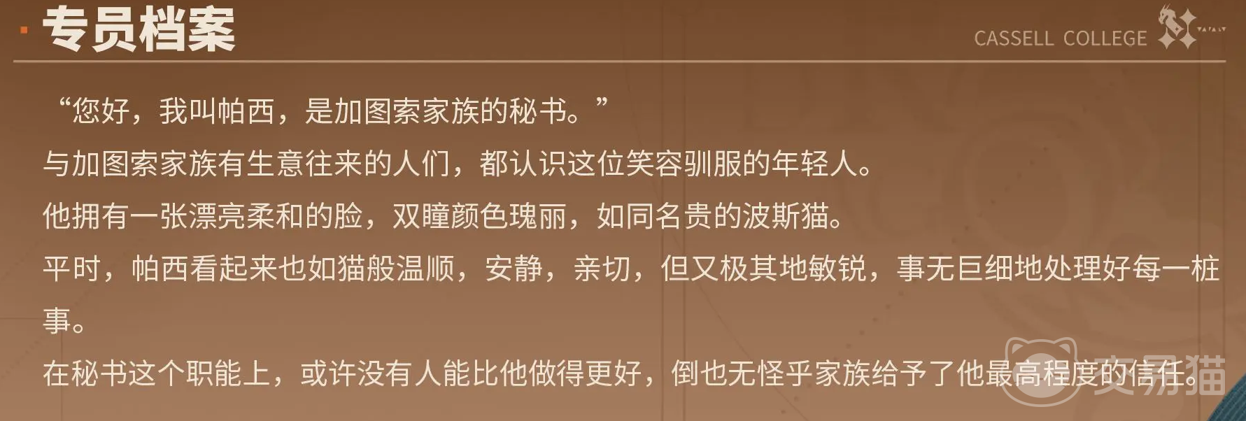帕西,全名不详,作为加图索家族的秘书,他拥有一张漂亮柔和的脸庞,双瞳颜色瑰丽,如同名贵的波斯猫。在众人眼中,帕西总是保持着猫般的温顺、安静与亲切,但实则他极其敏锐,能够事无巨细地处理好每一桩事务。尽管帕西在家族中保持着低调的姿态,甚至试图隐藏自己的姓氏、家族背景以及个人特征,但他在战斗中的表现却无愧于加图索的名号。从湮没之井的混战到婚庆大厦的驰援,帕西用一场场以命相搏的战斗证明了自己是一位当之无愧的战士!在龙族卡塞尔之门的角色强度排行榜中,帕西凭借其均衡的属性和出色的技能组合,稳居前列。作为前排角色,帕西不仅拥有较高的生命值和防御力,能够在战场上承受大量的伤害,还具备不俗的输出能力和控制能力,能够有效地干扰和削弱敌方。此外,帕西的技能设计非常灵活,可以根据不同的战斗场景和队友配置进行调整,使他在各种队伍中都能发挥重要作用。