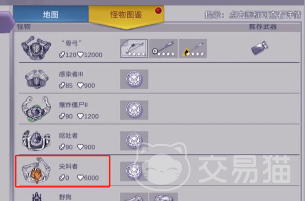 通过怪物图鉴我们先了解一下尖叫者的属性。发现它攻击力为0,血量倒有6000,看上去很好打的样子。