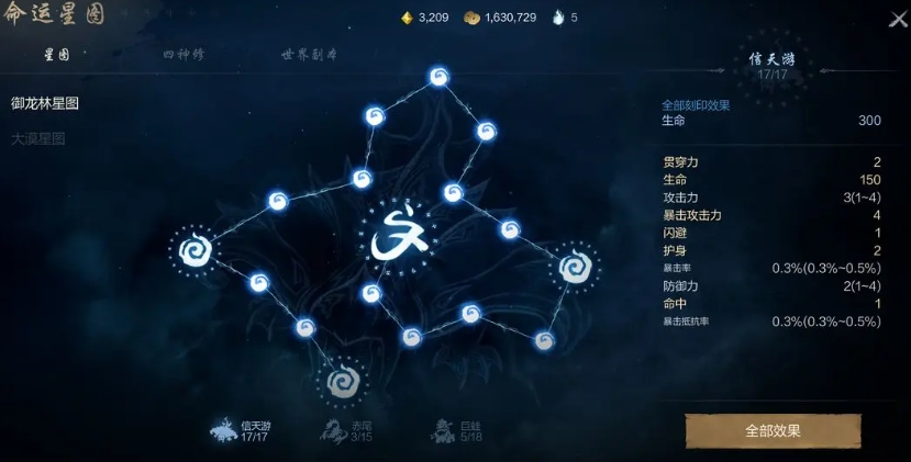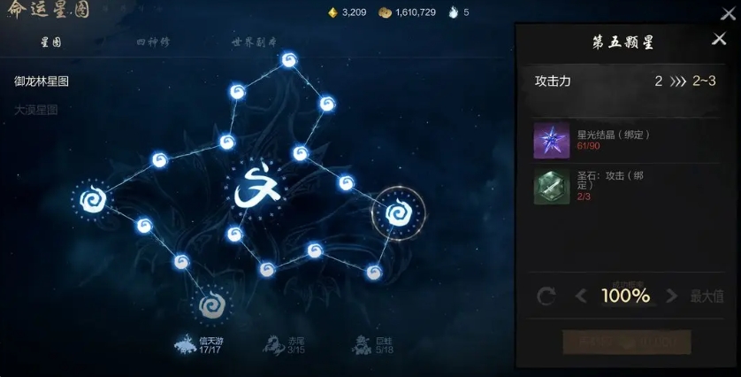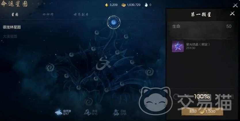 命运星图的功能开启后,玩家将首先接触到【御龙林星图】,这是星图分类的一部分。随着玩家角色等级的提升,更多的星图将逐步解锁。具体来说,玩家的角色等级需要达到50级才能解锁其他星图。每个星图中都包含多个节点,玩家可以使用星光结晶等材料来激活或升级这些节点。