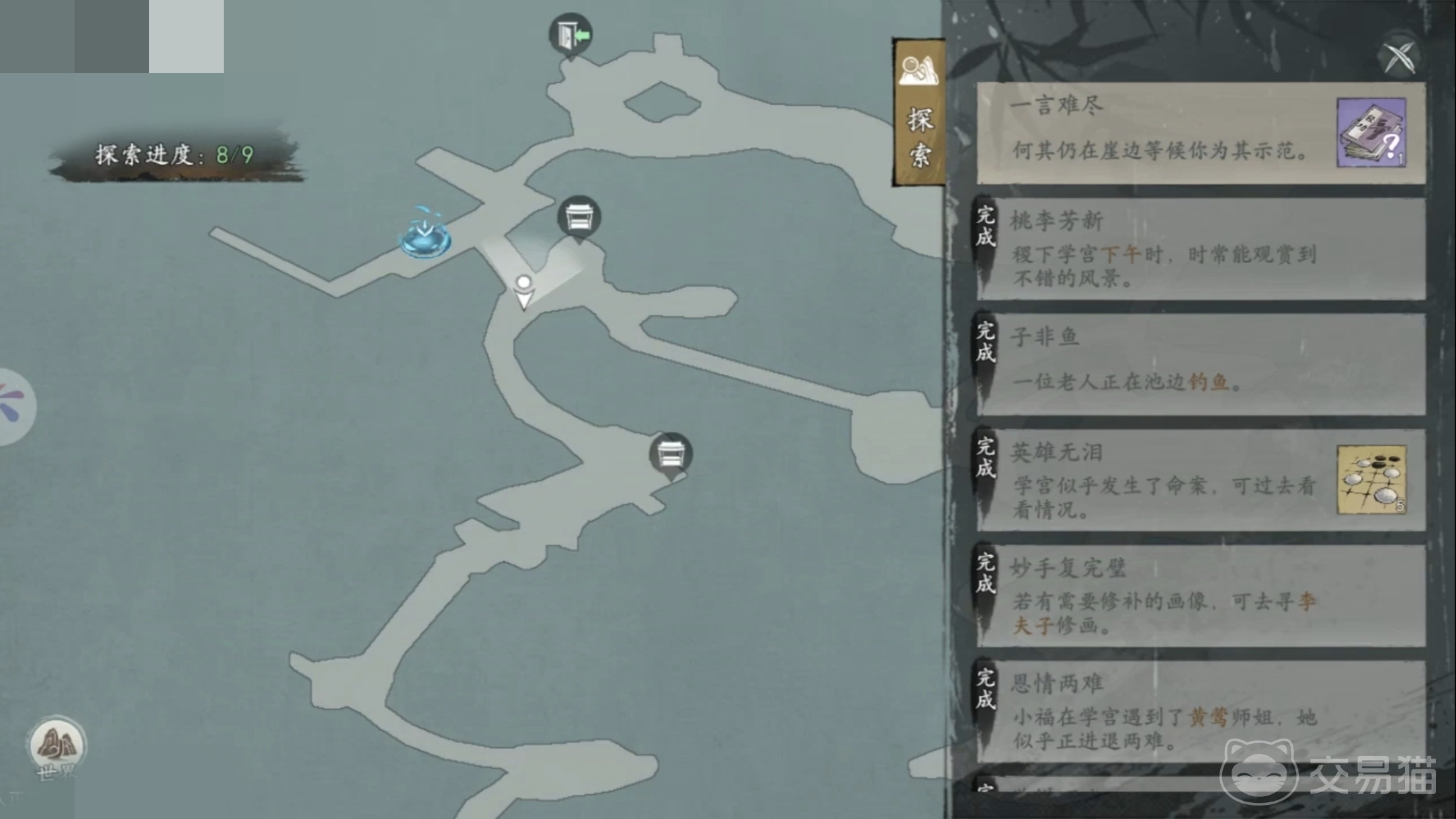 首先稷下学宫一共有九个大的世界任务,在地图界面上也会标出探索进度,每完成一个任务都会增加一次进度。任务都比较简单,都是单个的支线任务,遇到不同的npc,完成各式各样的挑战。比如帮老人钓鱼,或者帮助画画的专人寻找丢失的画件,通常需要跑腿的任务较多,不会有很多需要打怪的情况。