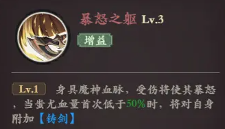 暴怒之躯:当蚩尤血量初次低于50%时,将触发暴怒之躯效果,为自身附加一个buff,按百分比增加攻击力,并且免疫所有控制效果。这个技能是蚩尤的保命神技。在血量告急时,暴怒之躯的觉醒让蚩尤如虎添翼,攻击力飙升成为敌人难以抵挡的梦魇。同时免疫控制效果,让蚩尤在关键时刻能够继续输出,为队伍争取胜利。