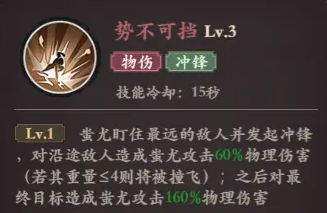 势不可挡:蚩尤盯住最远的敌人并发起冲锋,对沿途的敌人造成60%的物理伤害,若其生命值低于一定百分比则将被撞飞,之后对最终目标造成160%的物理伤害。这是蚩尤的主要输出技能,也是他切入敌方后排的利器。两段伤害使得蚩尤在冲锋过程中既能清理沿途的小兵,又能对敌方后排造成致命打击。同时,撞飞效果还能起到一定的控制作用,为队友创造更好的输出环境。