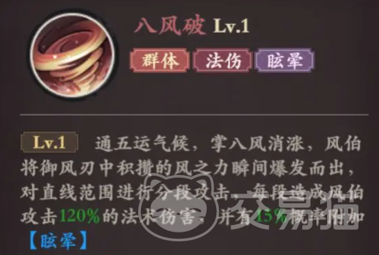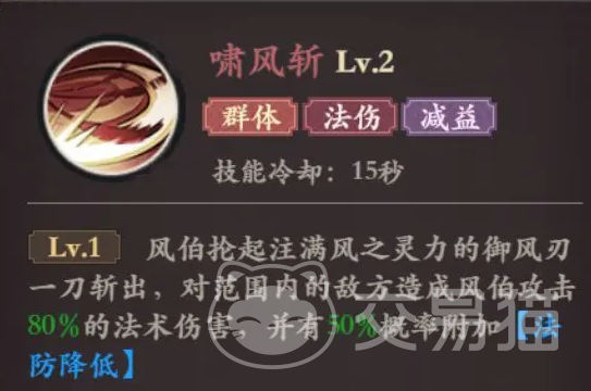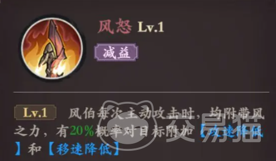 啸风斩:风伯主动对范围内的敌人释放一次攻击,造成风伯攻击力的法术伤害,并有概率对敌人施加“法防降低”效果。这是风伯的主要输出技能,不仅可以对范围内的敌人造成伤害,还能降低敌人的法术防御,为队友的后续输出创造有利条件。技能的核心点在于减防,可以大大提升法系队友的伤害。