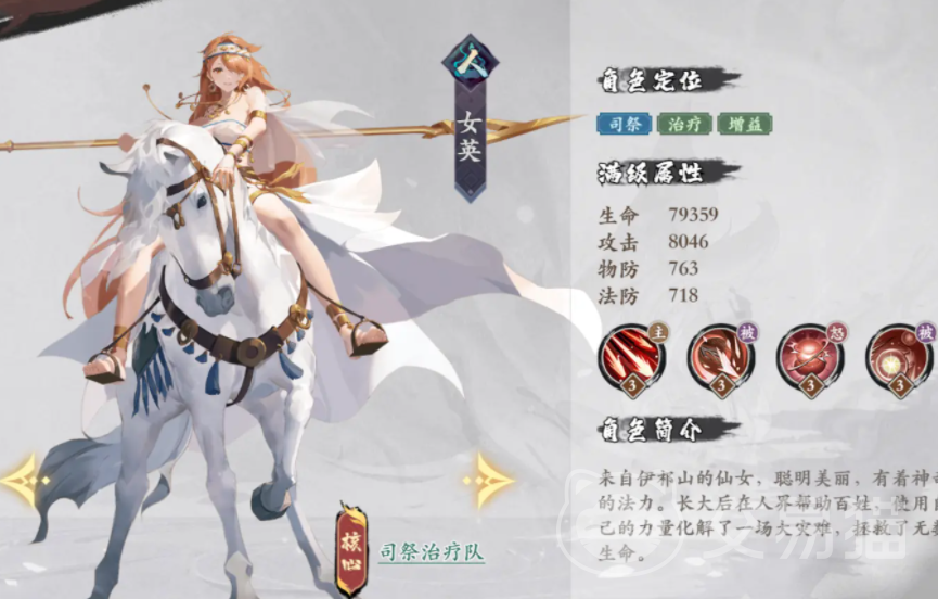 白马花神(被动):女英的被动技能,能够提升自身的生命值和攻击力。这个技能不仅增强了女英的生存能力,还使得她的治疗量和增益效果更加显著。
