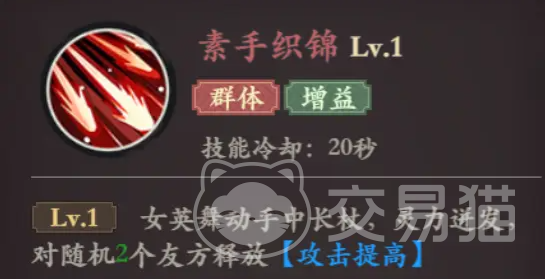 素手织锦(主动·增益):女英在使用技能的时候,可以对场上主动释放技能,对随机两个友方英雄施加“攻击提高”效果。这个技能可以显著提升队伍的输出上限,是团队战斗中的一大助力。