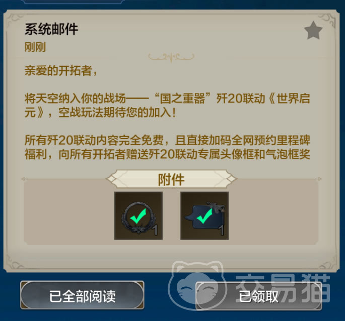 另外在游戏中,系统将会发送邮件为玩家免费送上专属的头像框和聊天对话气泡框。