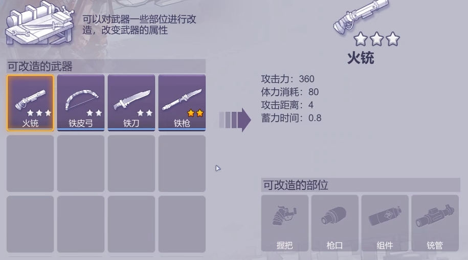 通过和军火商马叔交易或是打败特定敌人时还有几率获得铁枪蓝图和配件,比如玩家需要的火铳制作图纸,就可在“拯救村民于水火”的任务中通过搜刮获得,在得到以后,就可在工作台界面根据提示准备所需材料,其中包括20个生铁、2个短水管和4个胶带,而制作的过程大概也就5秒左右。