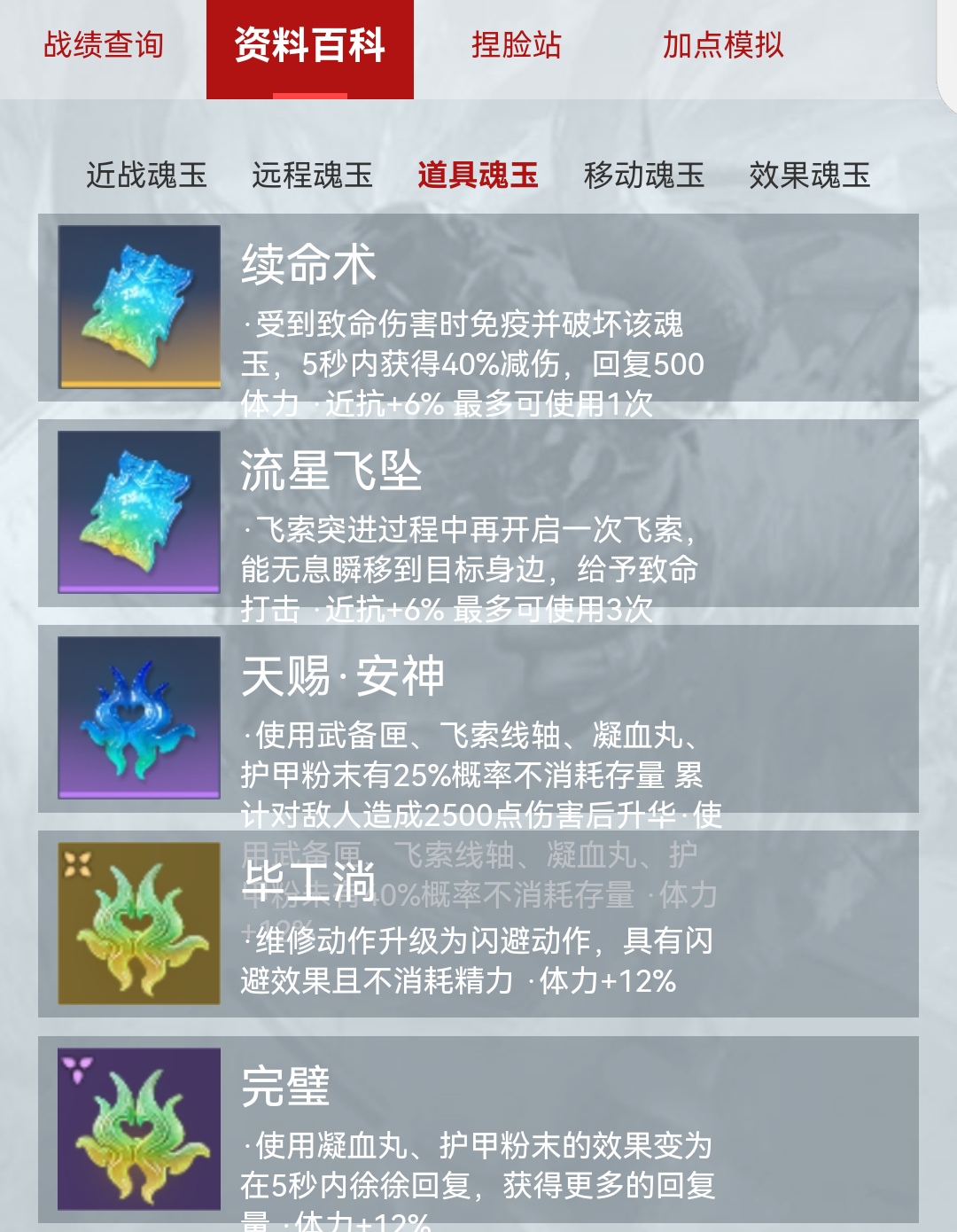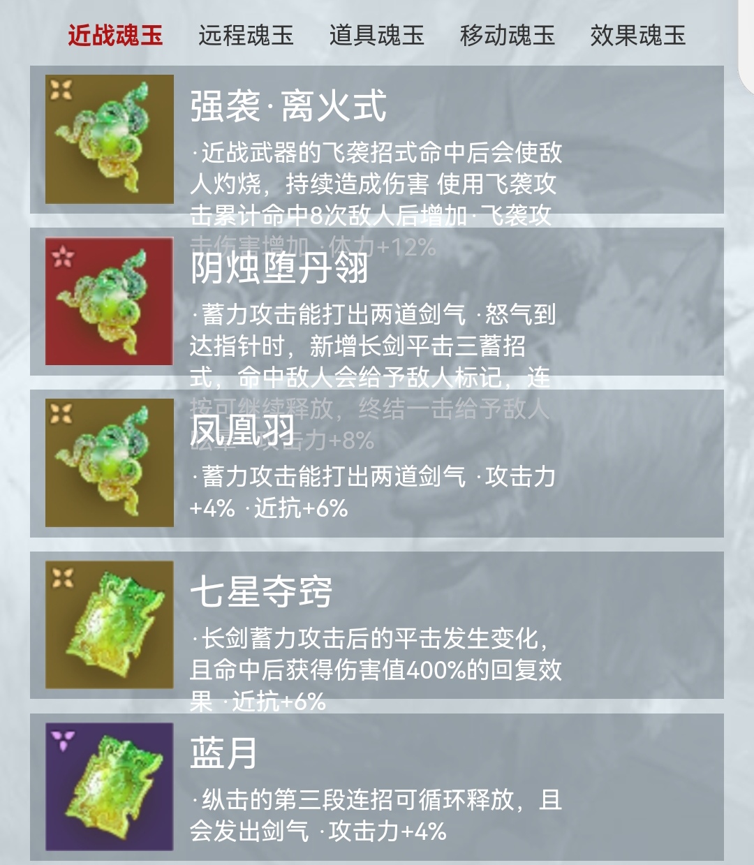 除了两种消耗类,还有五种基础类以及两种减伤类,两种体力类,两种攻击类型,在移动方面,也有13种魂玉可以来使用,包括一种消耗类型的,跟两种移动基础类型的,三种消耗类型的和七种效力基础类型,这些魂力都可以很好的提升大家的强度,无论是体力还是攻击还是近战以及远战等等。