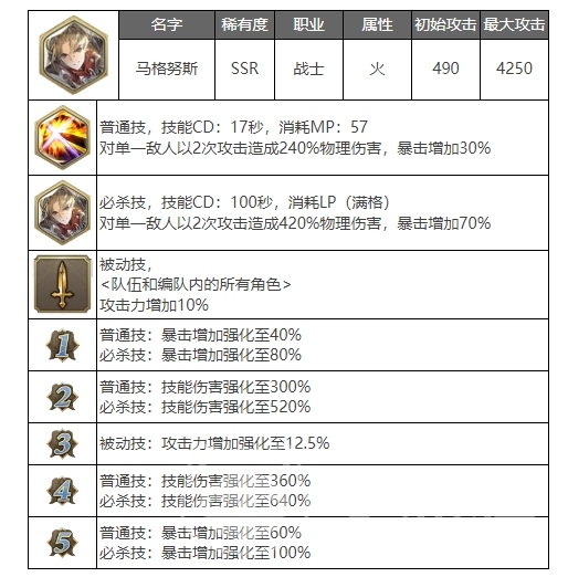 作为一名战士,马格努斯的技能设计充分展示了它的职业特色,最先,马格努斯的一般技能是一种强悍的攻击技能。技能冷却时间为17秒,蓝色57点(MP),它能够对单个敌人进行两次进攻,一共造成240%的物攻。此外,该技能还加入了30%的暴击率,这促使马格努斯在一般进攻中获得高暴击。