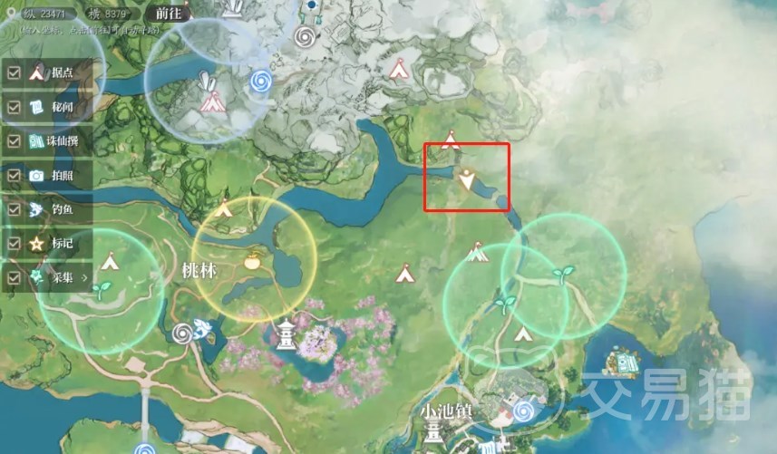 瀑下寻宝,所谓好山好水好风光,在瀑布之下竟然还隐藏着宝箱,坐标点大约是(23472,8380)的位置,如图所示青云山脚下与小池镇之间的这部分区域,有一处瀑布。