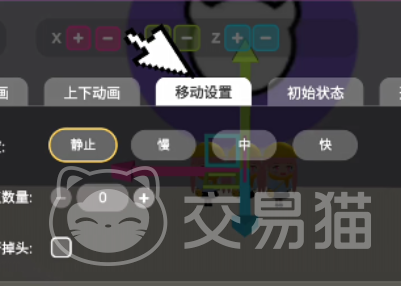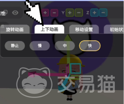 而如果小伙伴们需要进行上下动画编辑的话,那么操作方式和上面的旋转动画也是差不多的,小伙伴们需要先选中自己想要编辑的部位。出现三个箭头之后确保自己选择成功,然后在弹出的界面中选择上下动画,当然了,上下的速度也是可以选的,小伙伴们可以根据自己想要编辑动作的具体情况来选择动作的快慢。