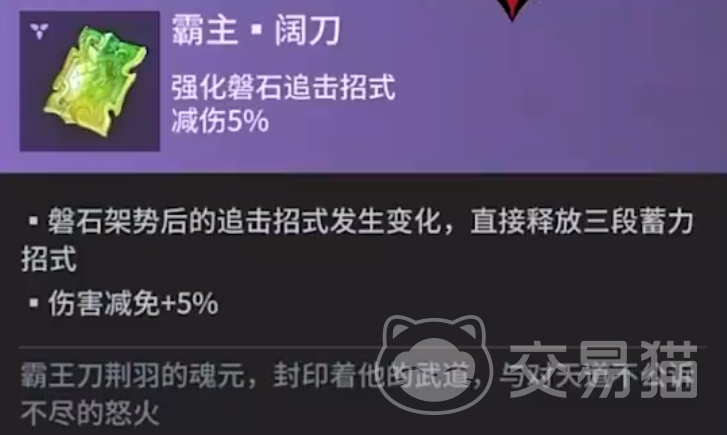 然后是霸主阔刀魂玉,可以提供5%的伤害减免效果,所以大家就算是激烈的近战也可以通过这个魂玉来得到额外的保护,这样的效果改变了磐石架势后的追击招式,使玩家能够直接释放三段蓄力招式,最后一个是夺魂阔刀也提供了5%的伤害减免,它的魂玉效果使得振刀反击更加有效,击中后可以获取伤害75%的回复效果,所以生存能力比较强。