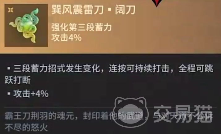 其实新手一般都是搭配的巽风震雷刀阔刀,装备这个魂玉后阔刀的基础属性会增加了4%的数值,这使得的后续大家发出每一个招式输出数值都有一定的提高,魂玉的效果改变了原先三段蓄力的输出招式,允后期大家就通过连按进行持续输出,甚至在战斗中也是可以通过跳跃的动作打断敌人招式的,这种灵活性对于大部分玩家来说都是适用的。