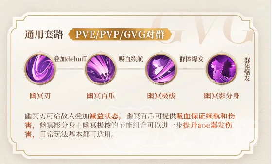 游戏的通用玩法是先用幽冥刃去叠加简易效果,然后再使用幽冥百爪,通过吸血效果维持自己的血量,然后用幽冥极梭打造爆发效果,最后用幽冥影分身收割。这里有的小伙伴或许会觉得幽冥百爪可用可不用,但大家要知道并不是每一次偷袭对方都是能够很稳定并且全身而退的,所以提前用这个技能最起码可以保持自己的血量,在一定时间内可以持续恢复,避免被敌人当场秒掉。