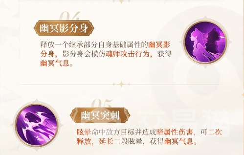 幽冥影分身是她的经典技能,可以释放一个自己的影子,这个影子会继承自己本体部分的基础属性伤害,还会模仿魂师的攻击,有一定的输出效果。幽冥突刺则是可以将自己的命中目标进行眩晕,而且能够二次释放这个技能,延长自己的晕眩时间,给队友提供输出环境,用来撤退也是很适合的。