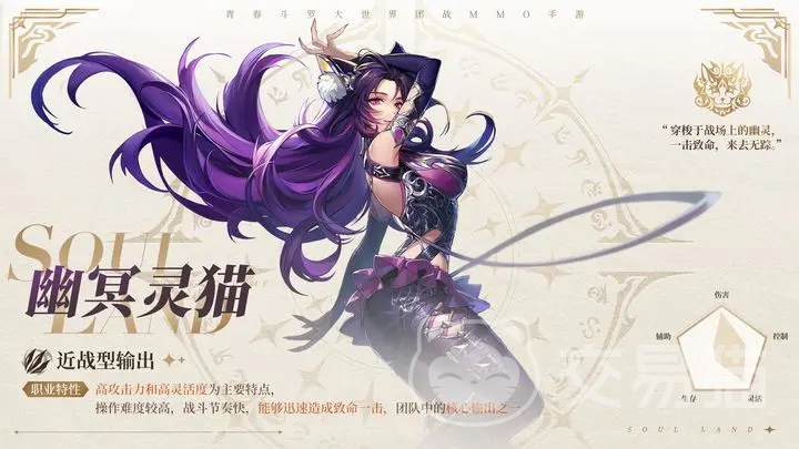 幽冥灵猫在游戏中是一个近战类型的输出职业,自身的攻击力是非常高的,而且十分灵活,所以有一定的操作难度,但是扛不住她的高颜值,还是有很多萌新玩家喜欢用。在很多的队伍当中,幽冥灵猫都是输出核心,能够快速出击,给敌人致命一击,往往可以瞬间带走敌方的输出位或者是辅助位。如果我方队伍当中有治疗系的角色,一定要在幽冥灵猫去袭击的时候注意她的血条状态,及时的给她补充血条预防死亡。
