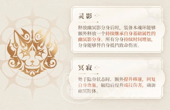 她的被动技能灵影可以在自己释放幽冥影分身之后,再次额外释放一个幽冥影分身,还能够持续继承自己基础属性,最重要的是所有分身的存在时间都会持续增加,而且分身也能替大家抵挡致命伤害,也可以理解成带有一定攻击属性的防御技能。被动技能冥寂则是在大家处于隐身状态的时候可以额外提升速度,并且回复自身的一定血量,可以在拉距离的时候使用,比如一套连招下来,一旦发现没能秒掉对方,就可以用这个来进行走位,恢复血量,等待刷新出来再次攻击敌人。